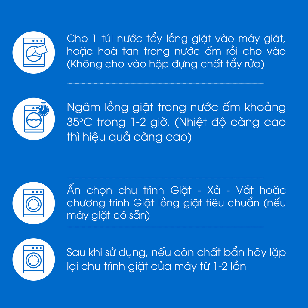 Đổ trực tiếp 1 gói (150g) vào lồng giặt.