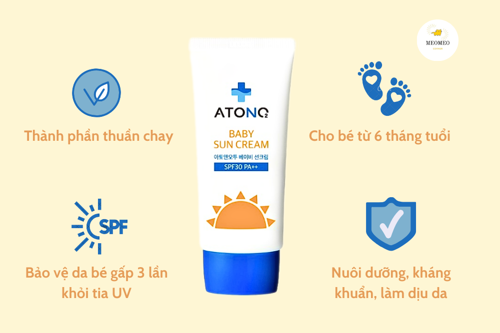Một sản phẩm khác được nhiều phụ huynh tin dùng là kem chống nắng thuần chay Atono2. Atono2 đã khẳng định được uy tín thương hiệu qua nhiều năm trong việc chăm sóc da cho trẻ nhỏ, và kem chống nắng của họ không phải là ngoại lệ.