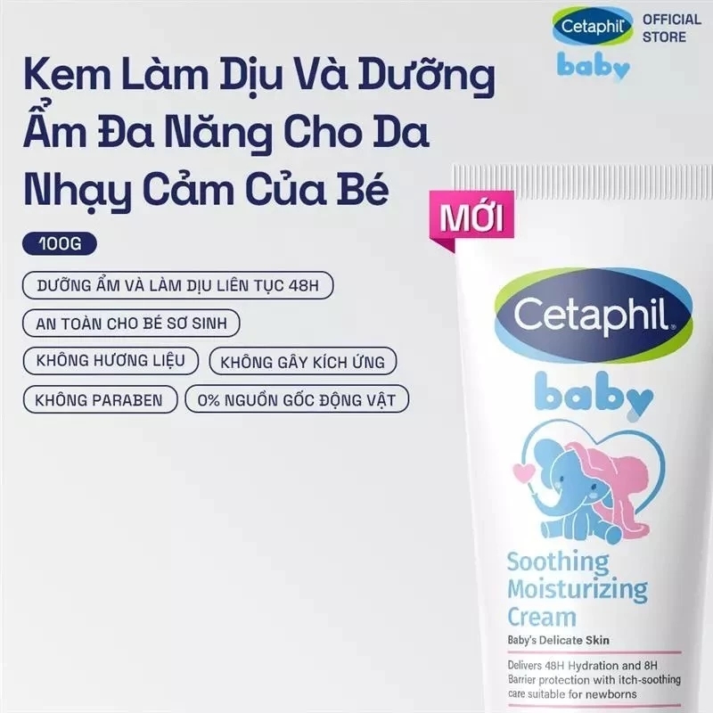 Dành cho vùng da khô, rất khô, dễ kích ứng và nhạy cảm của béKem làm dịu và dưỡng ẩm cho da mặt và toàn thân bé, với kết cấu dạng kem siêu mềm mịn, dễ thẩm thấu, được chứng minh lâm sàng giúp làm dịu tình trạng da khô bong tróc, mẩn đỏ, kích ứng, giúp cấp ẩm nhanh và khóa ẩm sâu lên đến 48 giờ, bảo vệ hàng rào da suốt 8 giờ ngay lần thoa đầu tiên.Công thức khoa học kết hợp bộ ba hoạt chất gồm Glycerin, Dầu hạt Hướng Dương và Dầu Hạnh Nhân, được chứng minh lâm sàng giúp:1. Cấp ẩm và khóa ẩm vượt trội lên đến 48 giờ liên tục2. Giúp bảo vệ hàng rào dưỡng ẩm tự nhiên trên da bé suốt 8 giờ ngay từ lần đầu sử dụng3. Hỗ trợ thúc đẩy quá trình phục hồi hàng rào bảo vệ da với kết quả rõ rệt sau 3 ngày sử dụng4. Giúp làm dịu các dấu hiệu nhạy cảm trên da bé, gồm khô da, căng da, da thô ráp, da kích ứng, hàng rào bảo vệ da suy yếu.5. Đặc biệt hiệu quả cho những vùng da khô sần, thô ráp, nứt nẻ (khuỷu tay, đầu gối, mắt cá chân, gót chân, những vùng da có vấn đề về hàng rào bảo vệ) cần khóa ẩm sâu và cần hỗ trợ phục hồiĐược kiểm định bởi Bác sĩ Da liễu Nhi khoa.Sử dụng an toàn cho trẻ sơ sinh.Dùng được cho mặt và toàn thân béKết quả khảo sát ý kiến đánh giá của ba mẹ sau 7 ngày sử dụng sản phẩm cho bé100% ba mẹ đồng ý sản phẩm giúp da bé ít bị kích ứng hơn100% ba mẹ đồng ý sản phẩm giúp da bé khỏe mạnh hơn100% ba mẹ đồng ý sản phẩm giúp da bé được dưỡng ẩm tốt hơn và mềm mịn hơnKhông gây kích ứng (hypoallergenic), không hương liệu, không paraben, không dầu khoáng, không petroleumThành phần:Aqua, Helianthus Annuus (Sunflower) Seed Oil, Glycerin, Dimethicone, Cetearyl Alcohol, Hydrogenated Vegetable Oil, Synthetic Beeswax, Methyl Glucose Sesquistearate, Prunus Amygdalus Dulcis (Sweet Almond) Oil, Tocopheryl Acetate, Dimethiconol, Phenoxyethanol, Potassium Cetyl Phosphate, Acrylates/C10-30 Alkyl Acrylate Crosspolymer, Disodium Edta, Ethylhexylglycerin, Sodium Hydroxide. Fil. 1835.V00ROUTINE1. Làm sạchLàm sạch dịu nhẹ da bé với Sữa tắm gội Hoa Cúc Hữu Cơ Cetaphil Baby Gentle Wash & Shampoo Organic Calendula. Cách dùng: cho sữa tắm vào tay hoặc khăn tắm và nhẹ nhàng thoa lên cơ thể của bé để tạo bọt, sau đó rửa sạch và lau khô nhẹ nhàng.2. Dưỡng ẩmSau bước tắm gội làm sạch, mẹ hãy dưỡng ẩm cho da bé với Kem làm dịu và dưỡng ẩm đa năng Cetaphil Baby Soothing & Moisturising Cream, giúp làm dịu tình trạng da khô bong tróc, nhạy cảm, giúp khóa ẩm vượt trội suốt 48H và hỗ trợ phục hồi hàng rào bảo vệ da, giúp da bé luôn mềm mại, mịn màng và khỏe mạnh.