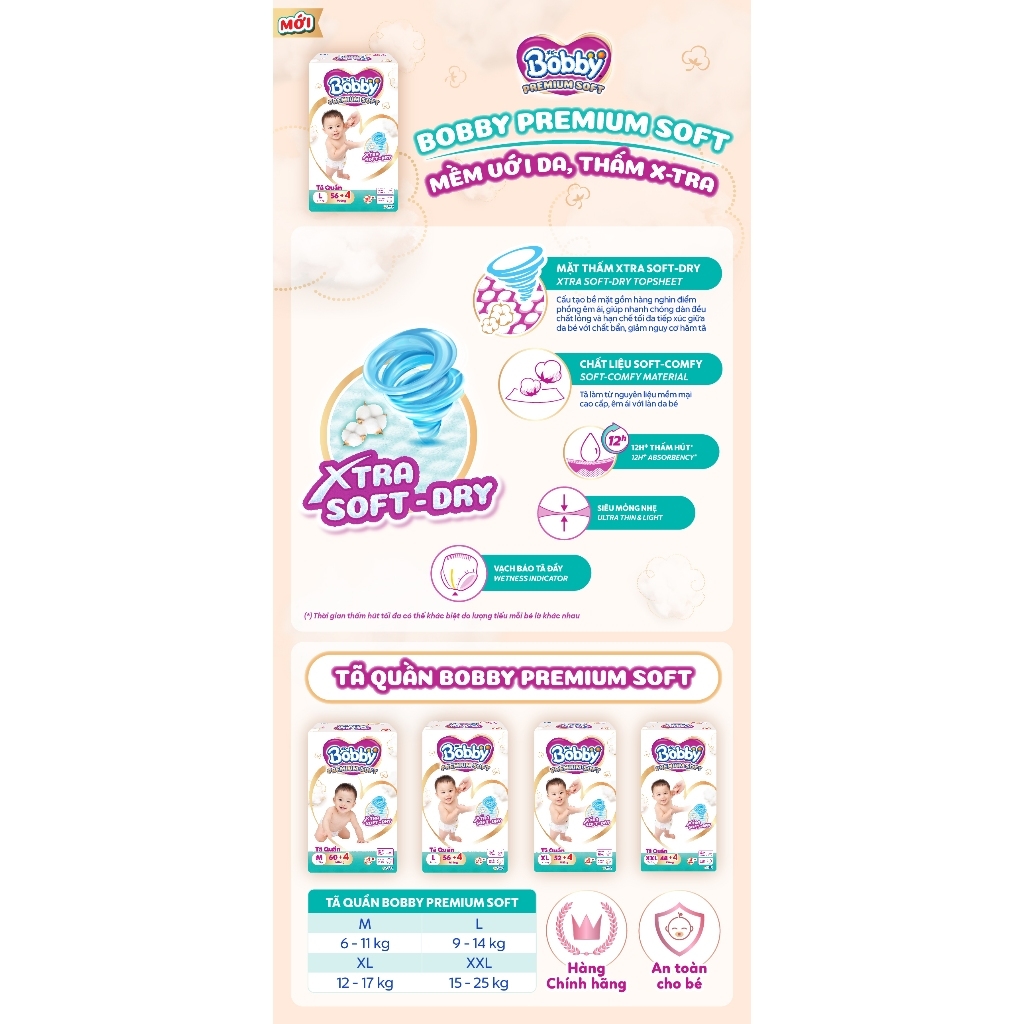 🍼 Tã Quần Bobby Premium Soft – Bảo Vệ Êm Ái, Khô Thoáng Cho Bé Yêu 🍼Dành cho các bé từ 6kg trở lên, Tã quần Bobby Premium Soft có các size M đến XXL để vừa vặn và đem lại sự thoải mái tối ưu cho bé. Với các đặc điểm nổi bật, Bobby Premium Soft là lựa chọn lý tưởng cho mẹ:💧 MẶT THẤM XTRA SOFT-DRY: Cấu tạo bề mặt gồm hàng nghìn điểm phồng êm ái, giúp nhanh chóng dàn đều chất lỏng và hạn chế tối đa tiếp xúc giữa da bé với chất bẩn, giảm nguy cơ hăm tã hiệu quả.🌿 CHẤT LIỆU SOFT-COMFY: Tã được làm từ nguyên liệu mềm mại cao cấp, cực kỳ êm ái và an toàn cho làn da nhạy cảm của bé.⏰ THẤM HÚT SUỐT 12H+: Tã có khả năng thấm hút lên đến 12 giờ (*), giúp bé ngon giấc suốt đêm và khô thoáng tối đa. (*Thời gian thấm hút có thể khác nhau tùy theo lượng tiểu của mỗi bé.)📏 SIÊU MỎNG NHẸ: Công nghệ ép lõi từ Nhật Bản giúp tã mỏng nhẹ, không gây dày cộm kể cả sau nhiều lần thấm hút, cho bé thoải mái vận động.🔵 VẠCH BÁO TÃ ĐẦY: Khi tã đã đầy, vạch báo sẽ chuyển sang màu xanh, nhắc nhở mẹ thay tã để bé luôn thoải mái.Bobby Premium Soft thuộc dòng tã cao cấp, êm mềm và dịu nhẹ, bảo vệ làn da bé yêu. Là thành viên của tập đoàn Unicharm – nhà sản xuất tã trẻ em số 1 Nhật Bản, chúng tôi cam kết mang đến cho bé sự thoải mái tối đa và là người bạn đồng hành đáng tin cậy bên bố mẹ trên hành trình chăm sóc bé.🏷️ Xuất Xứ và Hạn Sử Dụng🌏 Xuất xứ thương hiệu: Nhật Bản🏭 Nơi sản xuất: Việt Nam📅 Hạn sử dụng: 4 năm kể từ ngày sản xuất
